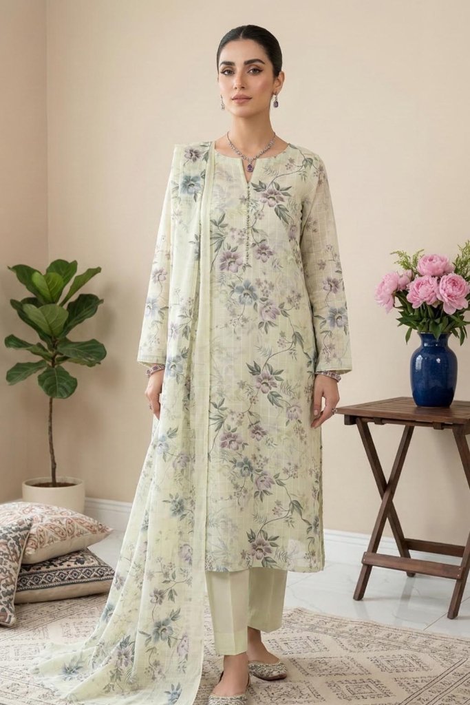 Pearl White Vol-2 Unstitched Digital Printed Lawn With Embroidered Front & 2 Side Scalloped Printed Voil Duppata PEA-011
