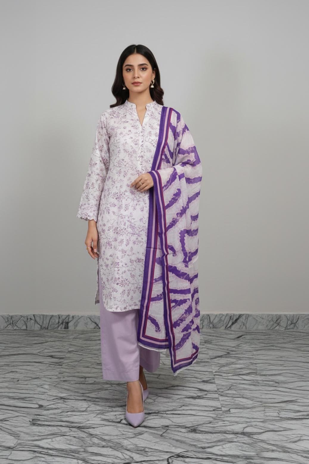 Pearl White Vol-2 Unstitched Digital Printed Lawn With Embroidered Front & 2 Side Scalloped Printed Voil Duppata PEA-015
