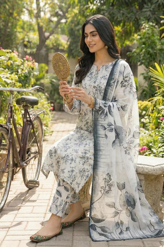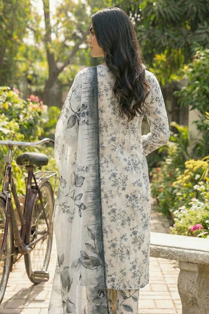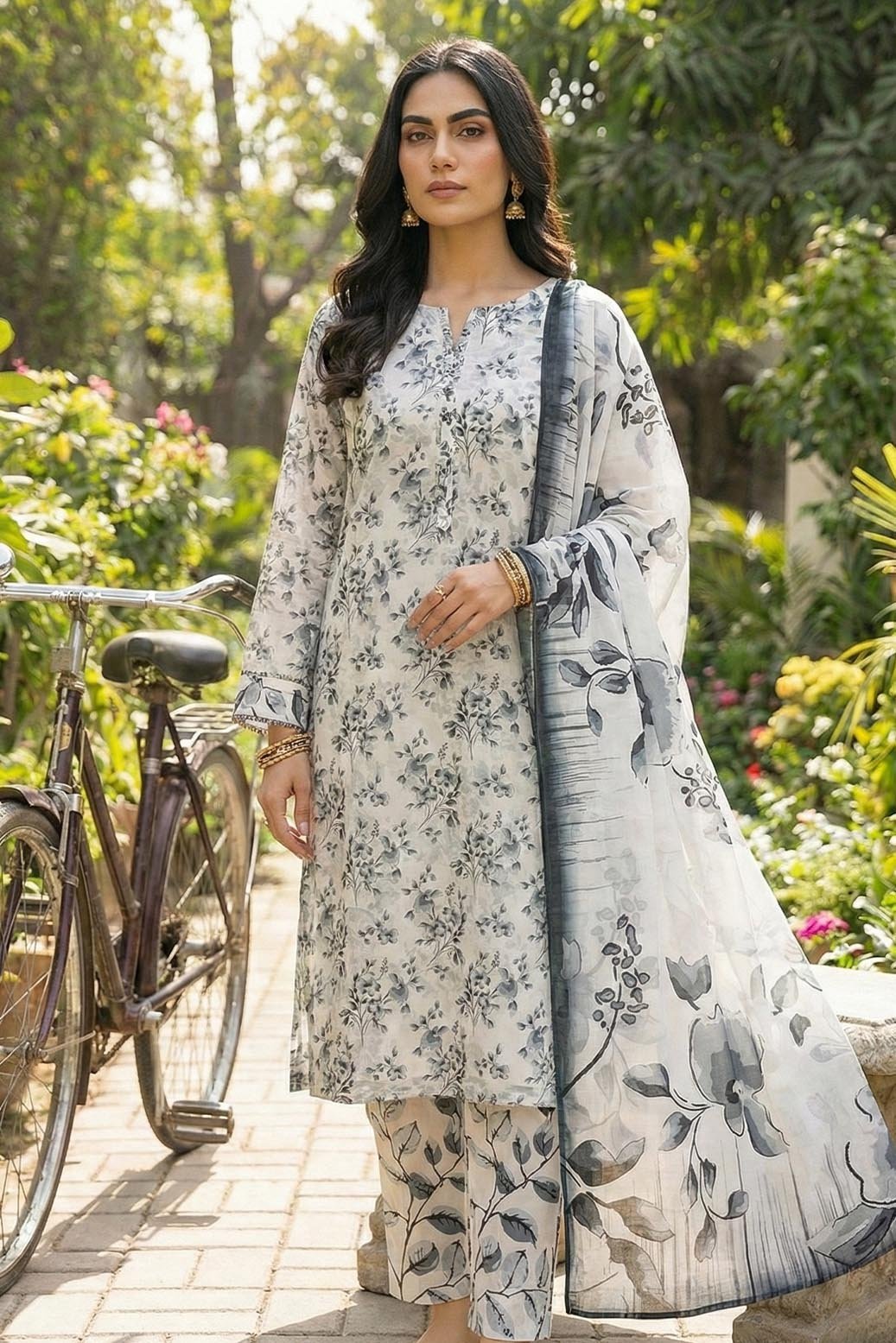 Pearl White Vol-2 Unstitched Digital Printed Lawn With Embroidered Front & 2 Side Scalloped Printed Voil Duppata PEA-013