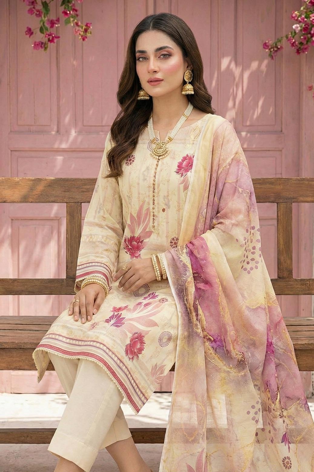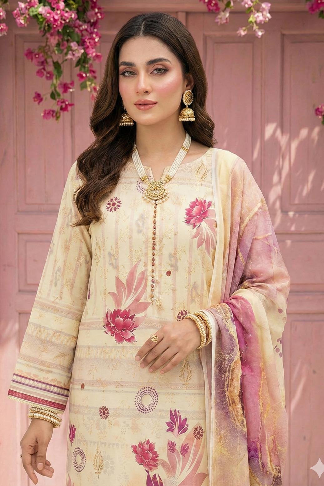 Pearl White Vol-2 Unstitched Digital Printed Lawn With Embroidered Front & 2 Side Scalloped Printed Voil Duppata PEA-014