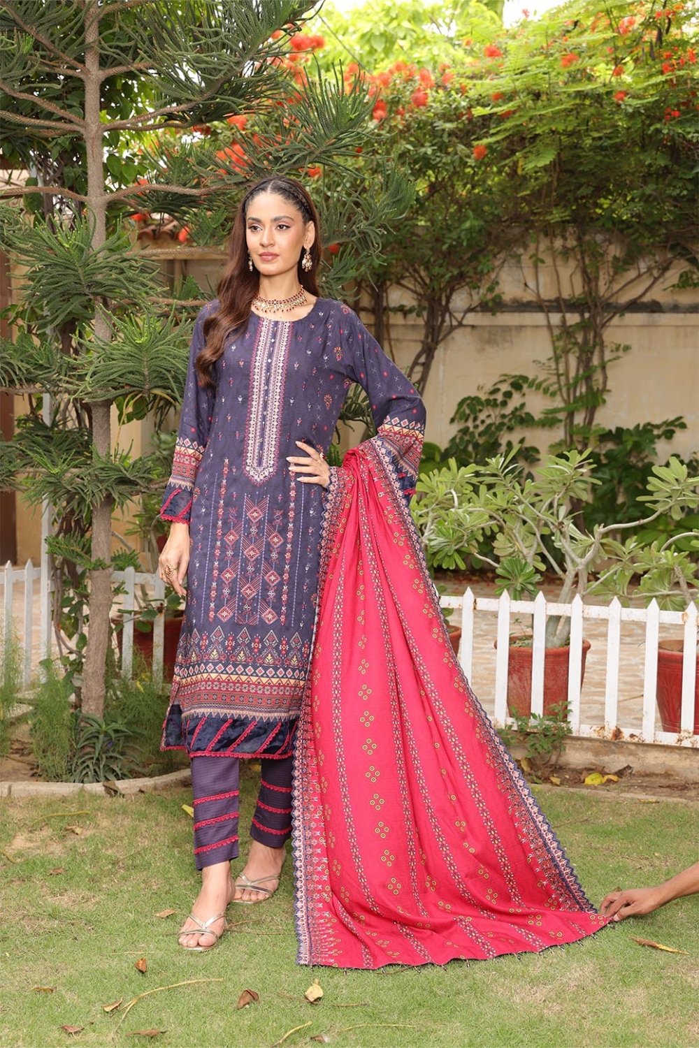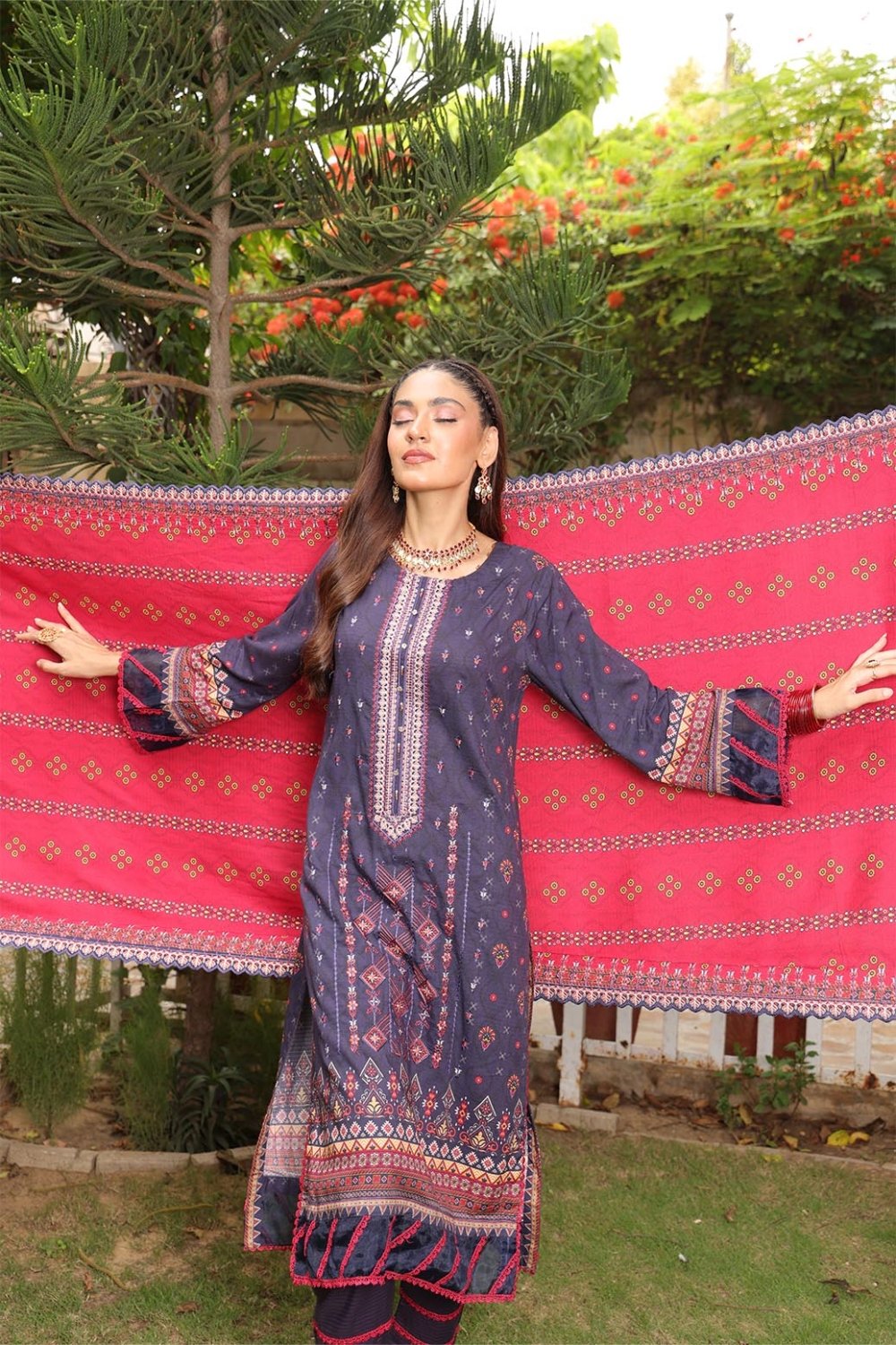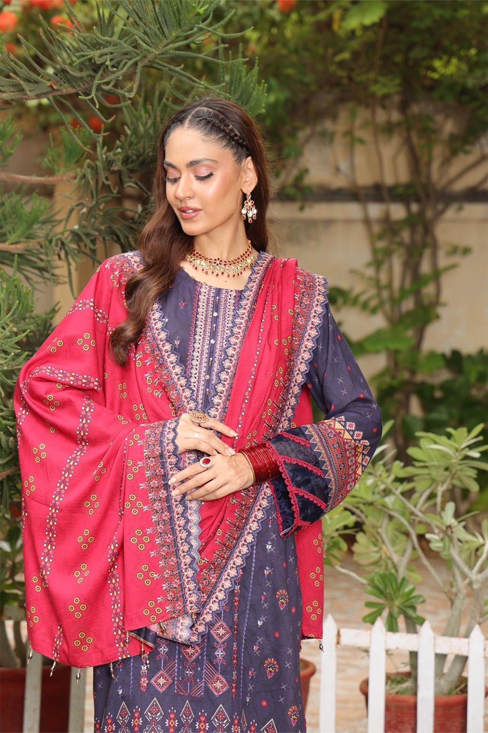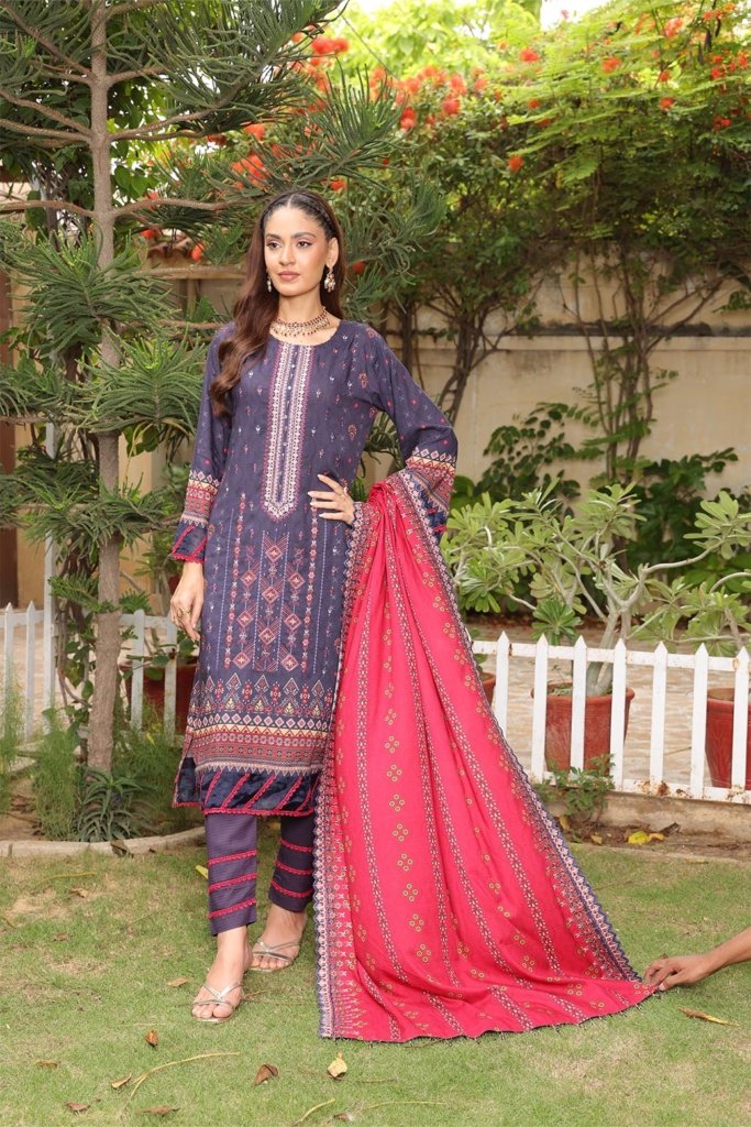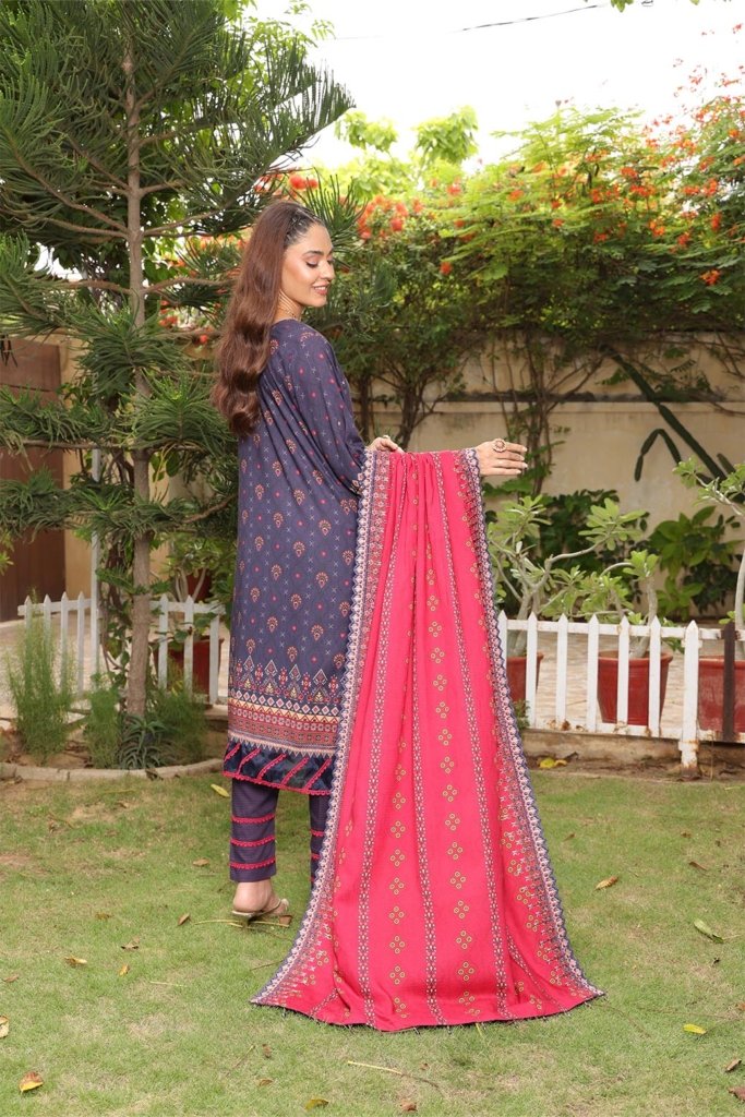 Unstitched Digital Printed Winter Doriya Shirt With Embroidered & Applique Front Digital Printed Winter Doriya Back Digital Printed Winter Doriya Sleeves 2 Side SCALLOPED CUTWORK Borders Duppata Dyed Winter doriyaTrouser