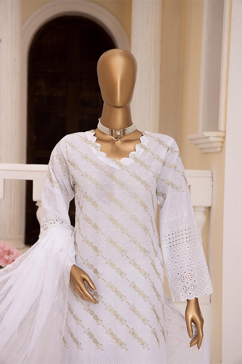 Be the first to review “Monochrome Unstitched Dyed Zari Schiffli Shirt With Fancy Embroidered Bamber Chiffon Duppata MON-004”