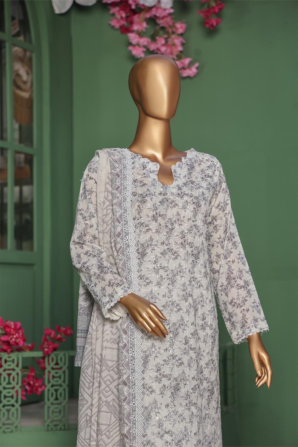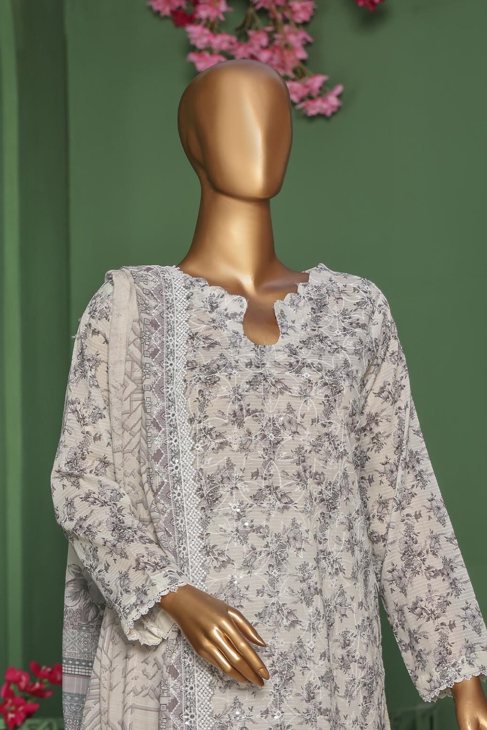Pearl White Vol-3 Unstitched Digital Printed Lawn With Embroidered Front & 2 Side Scalloped Printed Voil Duppata PEA-023