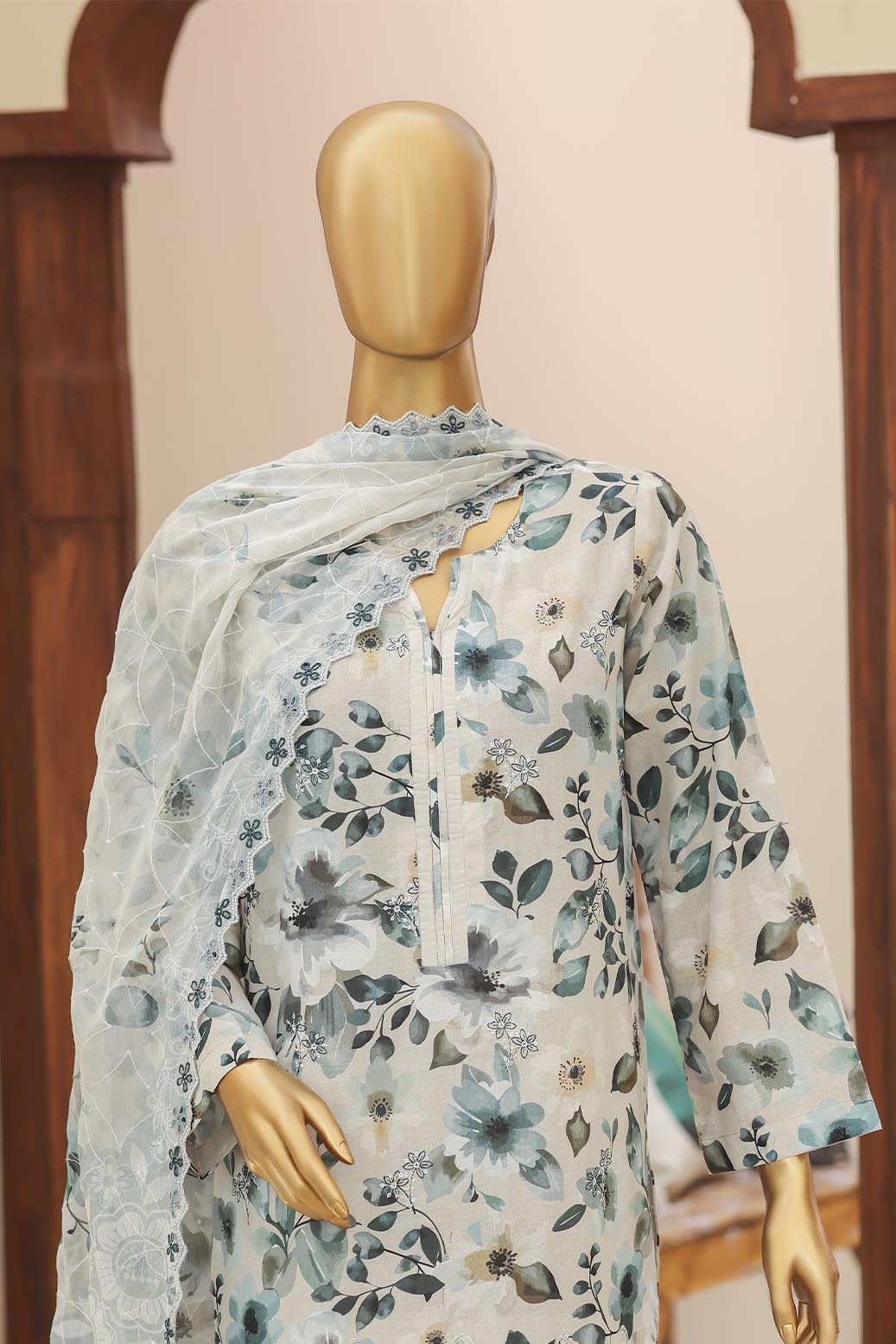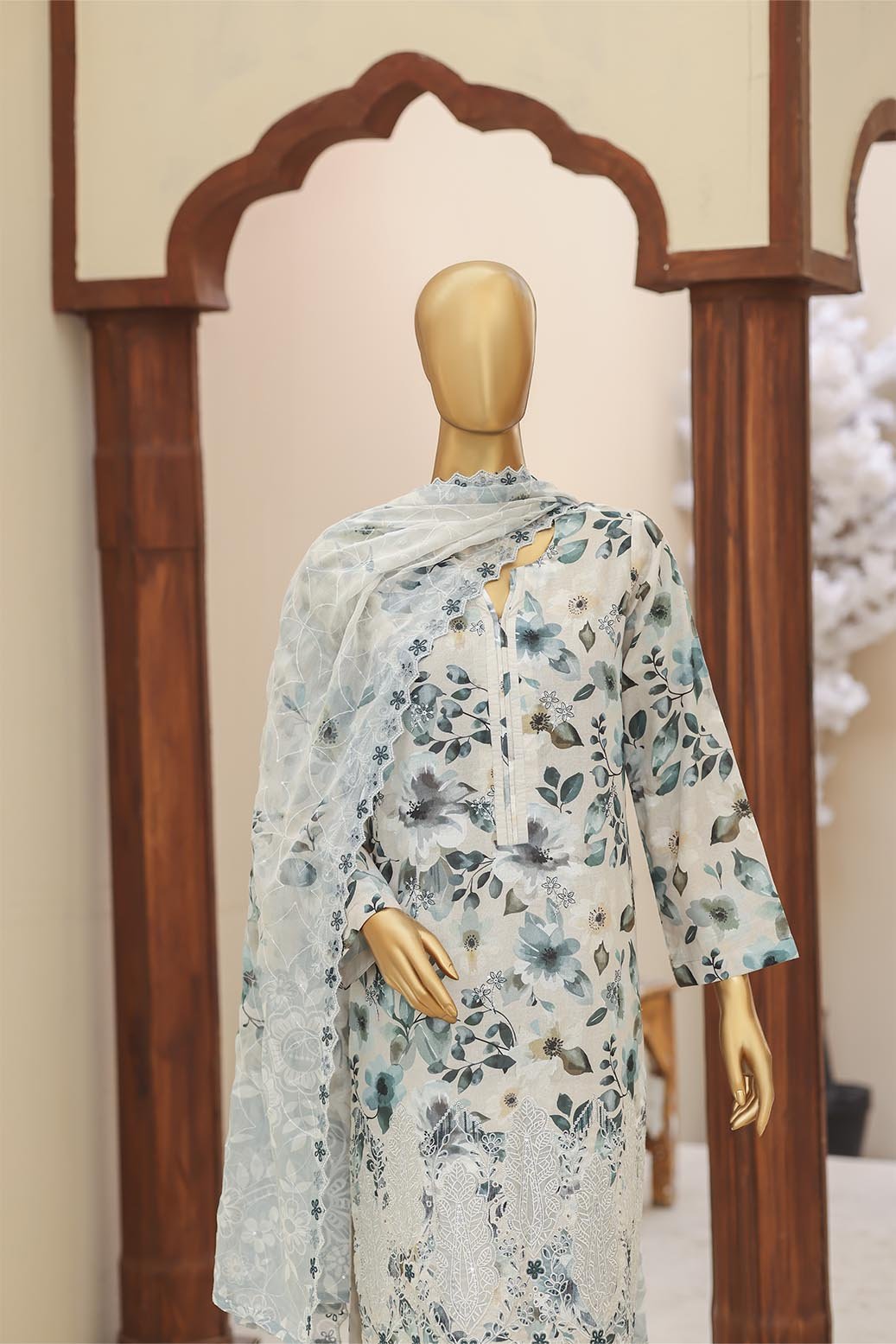 Pearl White Vol-2 Unstitched Digital Printed Lawn With Embroidered Front & 2 Side Scalloped Printed Voil Duppata PEA-015